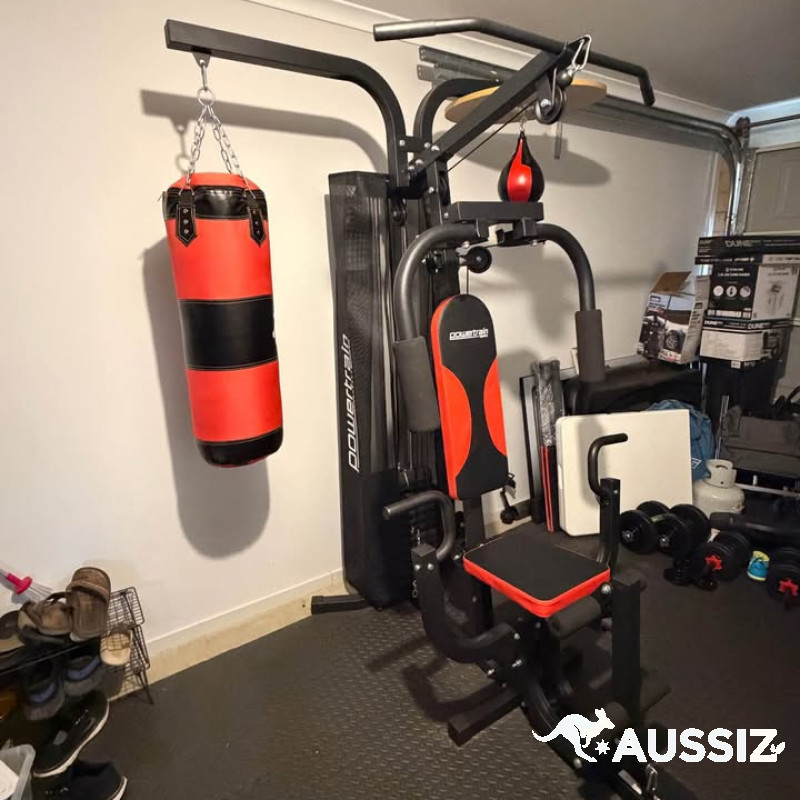 Bunnings Powertrain Home Gym Multi Station and Boxing Bag Speed Ball and Boxing Gloves